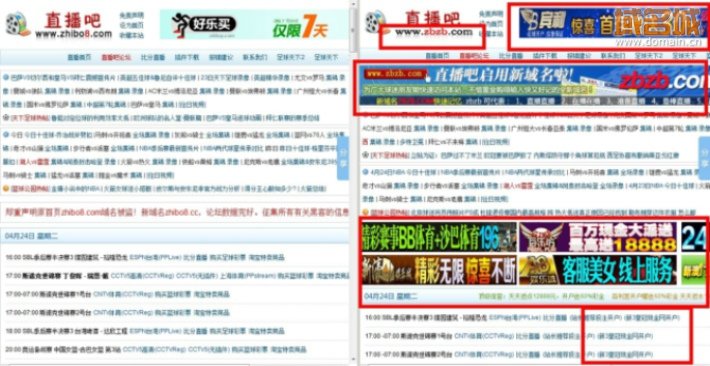![]() 被盜竊的直播吧發(fā)布的虛假公告頁面 筆者隨后聯(lián)系了直播吧(zhibo8.cc)的官方人員,官方人士稱,原域名zhibo8.com確實沒有追回,而盜竊該域名的非法人士也借用zhibo8.com該域名進行非法謀利、盜竊用戶信息等惡意手段。同時直播吧官方也提醒廣大用戶,目前直播吧的官方域名為zhibo8.cc,這也是當(dāng)前直播吧官方網(wǎng)站的唯一入口。 鑒于此,筆者也做出了新舊直播吧的比較,其中真假非常容易區(qū)分,在假“直播吧”上,到處張貼著非法賭球、網(wǎng)絡(luò)賭博等廣告。而真的直播吧(zhibo8.cc)頁面上則沒有任何的廣告,屬正規(guī)合法站點。