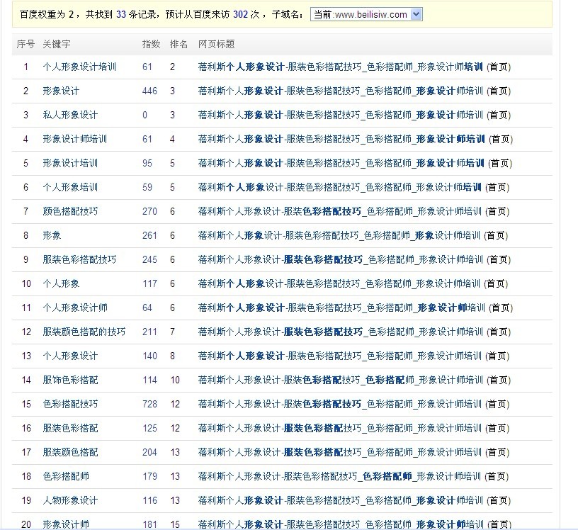 ![]() 基本上這些關(guān)鍵詞都是有一定百度指數(shù)的,其中不乏熱門(mén)詞,也有一些長(zhǎng)尾詞,總的來(lái)說(shuō)還算不錯(cuò),每天有200個(gè)左右的IP。因?yàn)槭瞧髽I(yè)站,而且剛起步,所以要求不是那么高,后期還有很大的進(jìn)步空間。 步入正題, 今天就系統(tǒng)的講一下網(wǎng)站優(yōu)化的三步曲: 第一步: 網(wǎng)站標(biāo)題優(yōu)化 網(wǎng)上有關(guān)標(biāo)題優(yōu)化的文章很多,我只說(shuō)重點(diǎn),我認(rèn)為其中的關(guān)鍵在于其對(duì)分詞技術(shù)的把握,以及長(zhǎng)尾詞帶動(dòng)熱門(mén)詞,標(biāo)題合理重復(fù),并且還要考慮到標(biāo)題的吸引力。 網(wǎng)站的標(biāo)題寫(xiě)法和排名是沖突的,因?yàn)閷?xiě)的吸引人,勢(shì)必會(huì)遺失掉一部分有價(jià)值的關(guān)鍵詞,很多站長(zhǎng),包括我也會(huì)有一個(gè)取舍的過(guò)程。我的建議是前期以流量和權(quán)重為主,后期可以適當(dāng)?shù)那械粢恍╅L(zhǎng)尾詞改成吸引眼球的品牌詞,就類(lèi)似于麥包包的優(yōu)化策略。 而在選詞上,不能盲目的依照自己的心理想法去選(大多數(shù)企業(yè)站的通病),而是要站在用戶(hù)的角度去想,其次還要考慮到一些重要的指標(biāo): 百度指數(shù)》首頁(yè)競(jìng)價(jià)位個(gè)數(shù)》首頁(yè)頂級(jí)域名個(gè)數(shù)》頂級(jí)域名的標(biāo)題關(guān)鍵詞排序情況》百度子產(chǎn)品占位情況》百度索引數(shù)量。 根據(jù)這些指標(biāo),來(lái)敲定你的關(guān)鍵詞,很多企業(yè)站的另一個(gè)通病就是想把所有詞都做了,那怎么可能呢?根據(jù)權(quán)重的分配規(guī)則,標(biāo)題中最先出現(xiàn)的關(guān)鍵詞權(quán)重最高,所以按照選詞的方法,根據(jù)難度和熱度依次排開(kāi)。 而且標(biāo)題關(guān)鍵詞的個(gè)數(shù)最好不要超過(guò)4個(gè),3個(gè)左右最為合適。前文中講到的分詞技術(shù)以及長(zhǎng)尾帶動(dòng)熱門(mén),標(biāo)題合理重復(fù)就尤為重要了,如何通過(guò)3-4個(gè)關(guān)鍵詞,衍生出幾十個(gè)關(guān)鍵詞,就是對(duì)關(guān)鍵詞選取技術(shù)的最好體現(xiàn)。 小技巧:把核心的關(guān)鍵詞,在頭部和尾部適當(dāng)?shù)闹貜?fù)一次,對(duì)核心關(guān)鍵詞排名是有顯著的提高作用的。 小結(jié):有關(guān)標(biāo)題的還有很多,就不過(guò)多去說(shuō)了,以上是比較關(guān)鍵的點(diǎn),還是重申一遍,網(wǎng)站的標(biāo)題選則對(duì)后期的優(yōu)化起到?jīng)Q定性的作用,一定要慎重,仔細(xì)。 第二步:網(wǎng)站內(nèi)容建設(shè) 網(wǎng)站的內(nèi)容大家都知道很重要,每日定時(shí)穩(wěn)定原創(chuàng),偽原創(chuàng)等等,但很多的人在做內(nèi)容的時(shí)候忽略了最重要的一個(gè)東西,且聽(tīng)我細(xì)細(xì)道來(lái)。 我們都知道網(wǎng)站的資源是有限的,什么意思呢,比如說(shuō)你的友情鏈接指向的錨文本,每天最多1-2個(gè)友鏈,所以在有限的資源下,關(guān)鍵詞的排名必須要分階段進(jìn)行,同理,你的內(nèi)容也必須要分階段去撰寫(xiě)。 舉例:第一階段你的外鏈錨文本都指向了“形象設(shè)計(jì)”這個(gè)詞,而你的網(wǎng)站內(nèi)容卻更新的大多數(shù)是色彩搭配、服裝搭配的文章,你說(shuō)效果能好么? 所以?xún)?nèi)容的建設(shè),并不是原創(chuàng)就可以了,而是要根據(jù)關(guān)鍵詞的階段排名計(jì)劃,分階段的去圍繞核心關(guān)鍵詞展開(kāi)譜寫(xiě)內(nèi)容,保證每個(gè)階段的大量外鏈錨文本背后,有相當(dāng)?shù)膬?nèi)容做支撐,這樣你的外鏈效益才能最大化,搜索引擎才會(huì)真正認(rèn)可你網(wǎng)站的權(quán)威性。 在這一點(diǎn)上,真正做的好的網(wǎng)站,我見(jiàn)的不多,有一些站長(zhǎng)并不是不懂這個(gè)道理,而是刻意忽略,為什么呢?因?yàn)闉槊恳粋(gè)階段的關(guān)鍵詞去專(zhuān)門(mén)的寫(xiě)足夠的內(nèi)容,是很辛苦的事情,很多站長(zhǎng)不喜歡這么累,所以都是想到哪寫(xiě)到哪,去A網(wǎng)站抄一點(diǎn)偽造一下,然后再去B網(wǎng)站抄一點(diǎn)偽造一下,每天更新的量雖足,但是很雜,對(duì)核心關(guān)鍵詞排名的促進(jìn)起不到一個(gè)決定性的作用。 小結(jié):步入2012年以來(lái),我們都知道搜索引擎對(duì)網(wǎng)站的內(nèi)容質(zhì)量越來(lái)越看重,內(nèi)容所給予的權(quán)重也越來(lái)越高,但切記不可盲目的去更新內(nèi)容,而是要每個(gè)階段的計(jì)劃去更新內(nèi)容,這樣關(guān)鍵詞的排名才會(huì)有質(zhì)的變化。 第三步:外鏈建設(shè) 常規(guī)的外鏈我也不多說(shuō)了,大家都是重復(fù)在做,我只說(shuō)兩點(diǎn)比較關(guān)鍵的。 1.友情鏈接的導(dǎo)出控制,很多網(wǎng)站,權(quán)重沒(méi)多少,導(dǎo)出卻達(dá)到30-40個(gè),甚至更多,每天卯足了勁到處換鏈接,對(duì)于這樣的站長(zhǎng),給你個(gè)忠告,真的沒(méi)用,蛋糕原理沒(méi)聽(tīng)說(shuō)過(guò)嗎?你網(wǎng)站總共就那么點(diǎn)權(quán)重,你全都分出去了,你靠什么去排名?所以友情鏈接真的在精不在多,很多站友情鏈接只有幾個(gè),但排名很穩(wěn)固,因?yàn)榫W(wǎng)站的權(quán)重非常集中。 切忌不可盲目追風(fēng),看著競(jìng)爭(zhēng)對(duì)手有幾十個(gè)友情鏈接,以為自己數(shù)量上少了所以排名才不